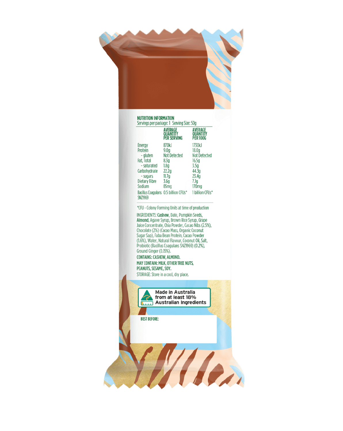 Cashew, Date, Agave Syrup, Faba Bean Protein, Pumpkin Seeds, Grape Juice, Rice Malt Syrup, Cacao Nibs (4%), Almond, Pea Protein Crisp (Pea Protein, Rice Flour). Chocolate (3%) (Cacao Mass, Organic Coconute Sugar Sap), Water, Natural Flavours, Organic Coconut Oil, Salt, Natural Gingerbread Flavour, Probiotic (Bacillus coagulans SZN1969), Ground Ginger (0.2%)