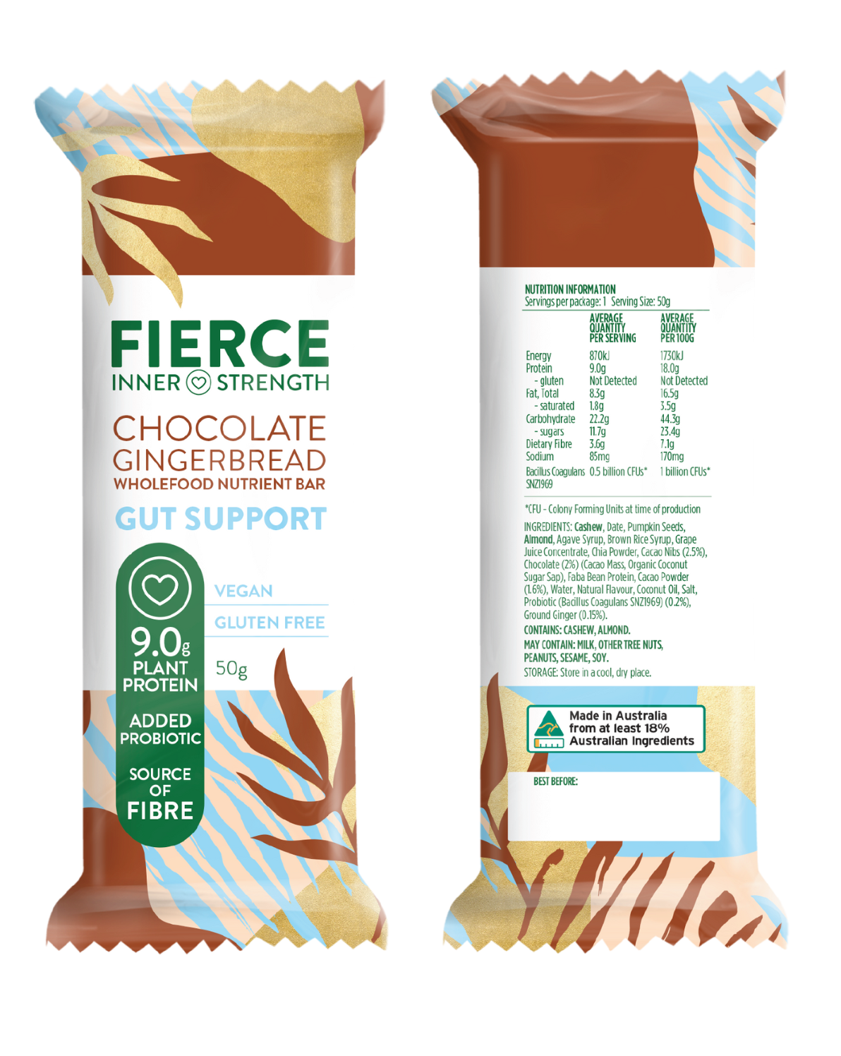 Support your gut health with our Chocolate Gingerbread bar topped with yummy cacao nibs! This bar contains added probiotics and ginger to support digestion and promote overall gut health.